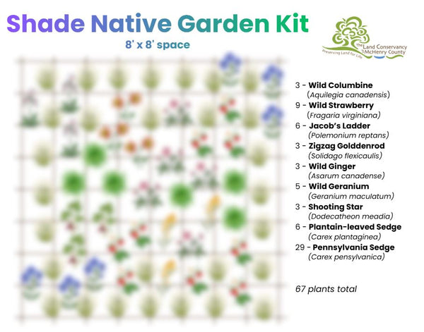 Description: Feeling overwhelmed by garden design? Here's the answer! This kit contains a laminated design layout for an 8ft x 8ft shady space and 67 native plants that love our woodland habitats. Perfect for around an oak tree or as a stand-alone garden! Based on the principles of matrix design, this kit contains everything from ground-covering sedges to beautiful wildflowers to feed a diversity of pollinators and support our native trees. The density leads to plants covering the ground quickly, leading to increased weed suppression. All species are chosen to grow nicely together in a small space. The back of the laminated design even contains tips and tricks for successful garden stewardship!
